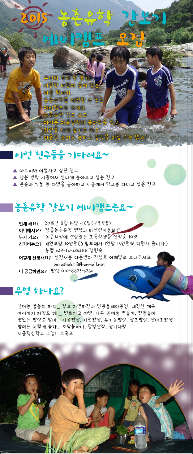 농촌유학 간보기 예비캠프 모집(초등학생) 작성자밥샘|작성시간15.08.10|조회수36 목록 댓글 0 글자크기 작게가 글자크기 크게가 *참조: 다음 카페 http://cafe.daum.net/dongmakfreeschool 다음검색 현재 게시글 추가 기능 열기 북마크 공유하기 신고 센터로 신고 댓글 댓글 0 댓글쓰기 답글쓰기 댓글 리스트