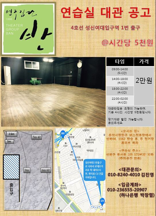 연극집단 반 연습실 대관 공고 ^^ 시간당 5천원 작성자송현섭|작성시간16.02.03|조회수153 목록 댓글 0 글자크기 작게가 글자크기 크게가 다음검색 현재 게시글 추가 기능 열기 북마크 공유하기 신고 센터로 신고 댓글 댓글 0 댓글쓰기 답글쓰기 댓글 리스트