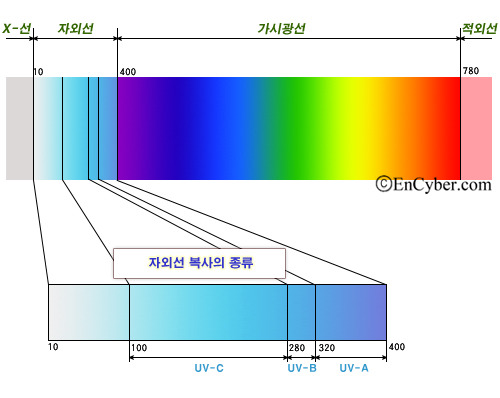 파장영역이 0.32~0.40㎛에 해당하는 자외선 UV-A 는 UV-B에 비하여 에너지량이 적지만 피부를 그을릴 수 있다.