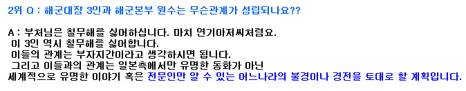 여담으로 해군 3대장의 선배 3명은 각각 3대장과 비슷한 성향을 가지도록 평행이론이 적용된 것 같습니다.
