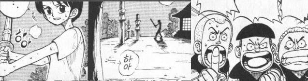 저 친구 세명의 뒷모습.. 쿠이나의 연습장면.. 바위로 수련하는 것은 조로가 100% 입니다.