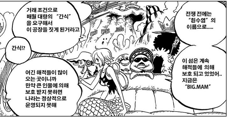 루피가 어인섬을 부셔서, 간식을 공급 못 받게 된 빅맘이 열받아서 부하를 보내서, 루피는 빅맘의 부하와 싸울 것 같아요.