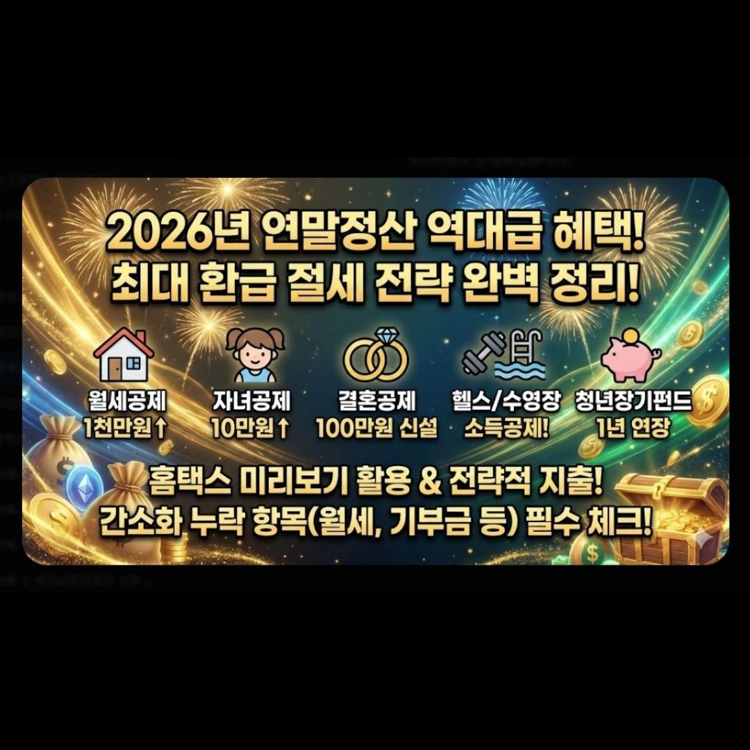 [추천 태그] #연말정산 #2026연말정산 #연말정산계산기 #홈택스미리보기 #절세꿀팁 #13월의월급 #월세세액공제 #자녀세액공제 #결혼세액공제 #소득공제전략 #환급금조회