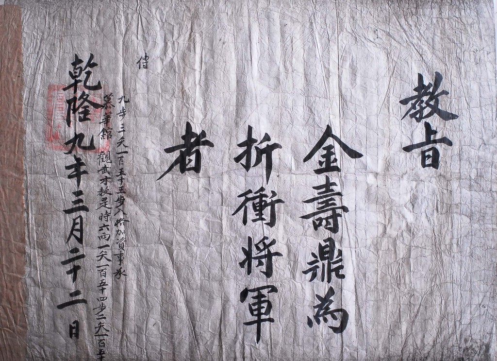 이 교지가 하사된 건륭9년은 영조 20년으로, 서기로는 1744년이다. 김성인 접장의 말에 따르면 이 분은 사도세자와 가까이지내며 호위를 하였다고 한다. 이 때는 사도세자가 살아있던 시절이니 호위하던 무관도 그 권세가 한창 잘 나가던 때였을 것이다.