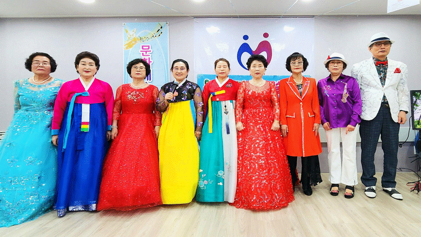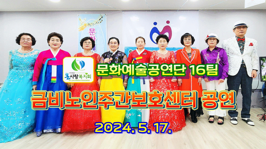 | 1. 일시 : 2024. 5. 17. 13:30~14:30 2. 장소 : 금비노인주간보호센터(비산동) 3. 출연(9명) : 김규순, 김필생, 이화자, 허미자(팀장), 안성자, 김월명, 변옥순, 이정숙, 박성구 4. 공연 내용 : 가요, 민요(장구), 무용, 하모니카 및 아코디언 연주 |