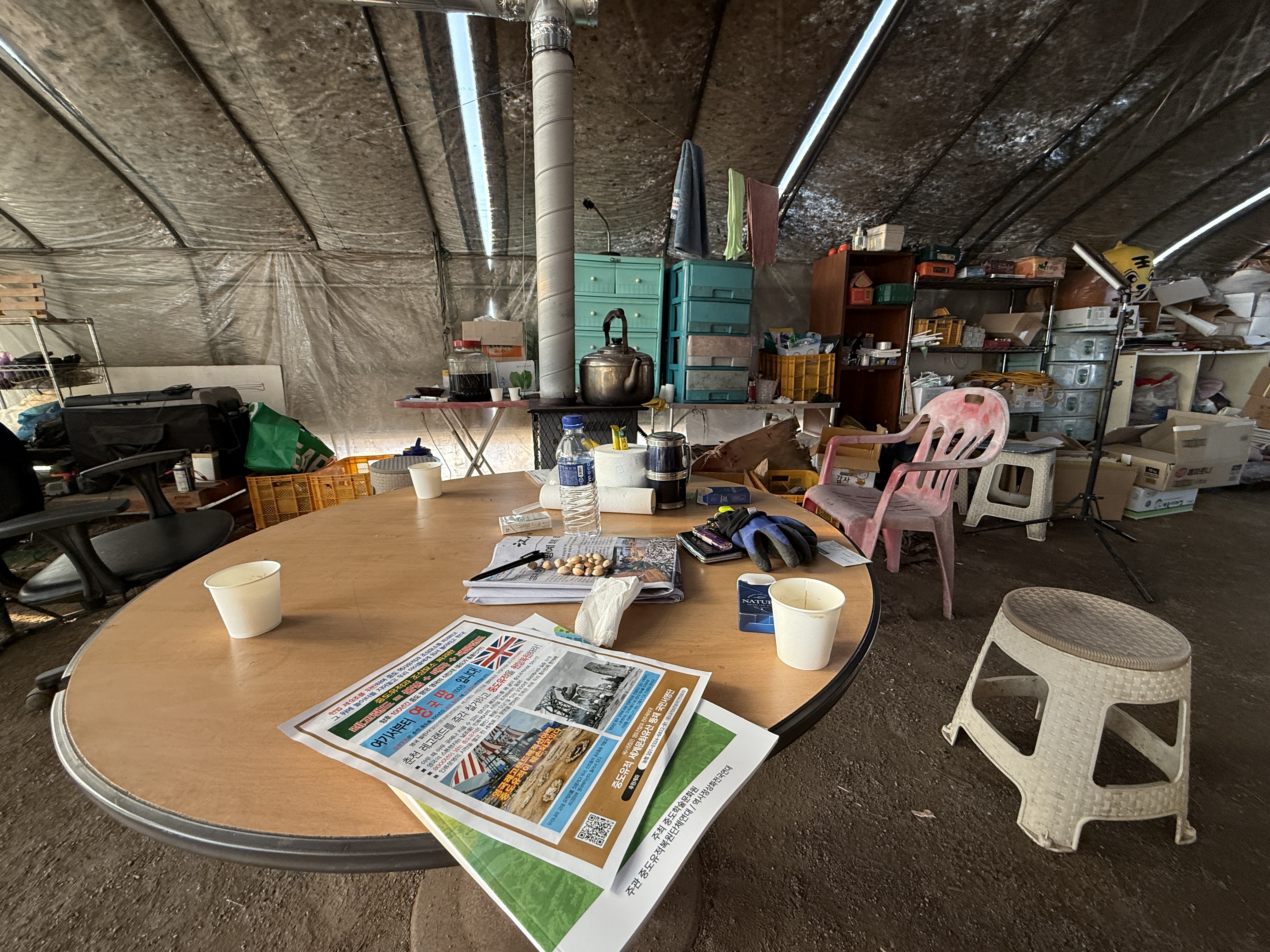 이들의 목소리를 듣고자 기자는 비닐하우스 안으로 들어가 이야기를 나눴다. 이들은 중도유적 보존 범국민연대회의(대표 오정규) 소속이었다. 본보는 이들이 하는 일이 무엇인지 물었다. 오정규씨는 “우리는 기자회견을 비롯해 큰 단체에 가서 학술회의를 진행해 레고랜드의 불법성을 호소하고, 중도유적의 중요성을 알리고 있다”고 말했다. 이들이 주장하는 레고랜드의 불법성이란, 레고랜드는 정식 준공 허가를 받지 못한 채 임시 사용 승인으로 운영되고 있다는 점이다.