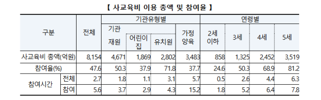 최근 교육부가 발표한 '2024 유아 사교육비 시험조사' 결과에 따르면, 영유아 사교육 참여율은 절반에 가까운 47.6%이며 특히 5세의 경우 무려 81.2%가 사교육을 받고 있는 것으로 나타났다. 1인당 월평균 사교육비는 33만 2천 원 수준이지만, 이른바 ‘영어유치원’이라 불리는 반일제 이상 유아 영어학원의 비용은 월평균 154만 5천 원에 달한다. 소득 규모에 따른 사교육비 격차가 7배에 육박할 정도로 유아 교육 시장의 과열된 경쟁은 이미 위험 수위를 넘어섰다.