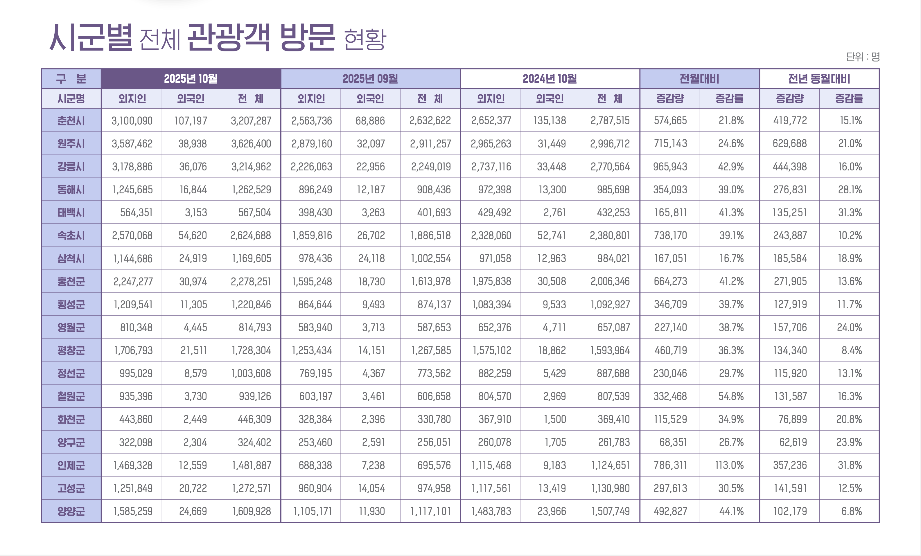 르네상스 사업 시행에도 불구하고, 강원도 내 관광 흐름 변화 속에서 춘천의 위상이 빠르게 약화되는 모습도 확인됐다. 2025년 10월 기준 강원관광재단이 공개한 빅데이터 기반 관광동향 결과를 보면, 기존 2024년 10월에는 춘천 방문객이 278만 7,515명으로 원주(299만 6,712명)에 이어 도내 2위를 기록했고, 이 기조는 2025년 9월까지 이어졌으나 올해 10월에는 원주(362만 6,400명)와 강릉(321만 4,962명)에 이어 320만 7,287명으로 3위로 내려앉으며 순위가 역전됐다. 즉, 춘천이 원주에 이어 2위를 유지하던 흐름이 1년 사이 강릉에 추월당하는 형태로 바뀌며, 도내 관광 수요의 중심축이 이동하고 있음을 보여준다.