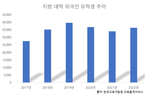 수도권을 제외한 외국인 유학생 추이를 보면 2017년 27,531명에서 2022년 36,361명으로 1.3배 늘었으며, 2019년까지 꾸준히 증가해오다 코로나 19로 인해 잠깐 주춤했지만 이후 계속해서 성장한 것으로 나타났다.