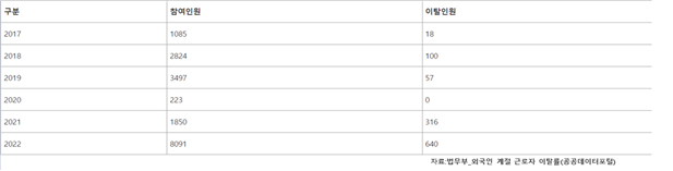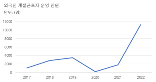 법무부에 따르면, 외국인 계절 근로자는 2017년 1,085명에서 2022년 11,342명으로 10.4배나 증가했다고 밝혔다.