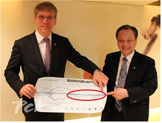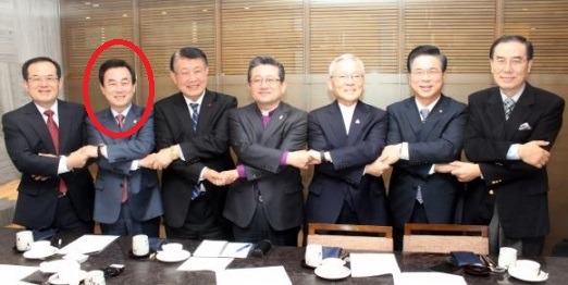 당시 통합교단 김동엽 총회장과 손가락으로 가리키고 있는 모습이다.
