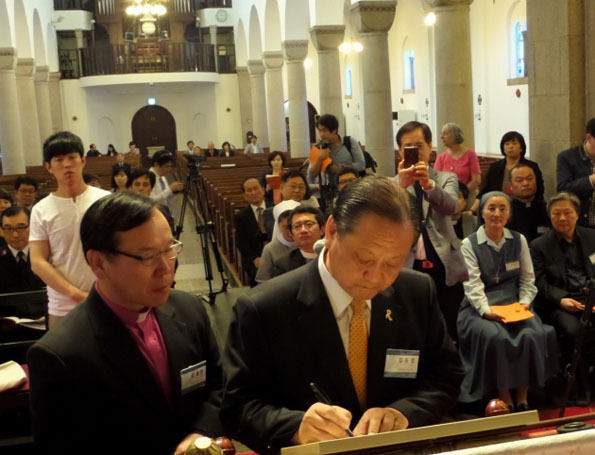 (신앙과 직제협의회 창립 선언문에 서명하고 있는 대한예수교장로회 통합교단 당시 총회장 김동엽 목사)