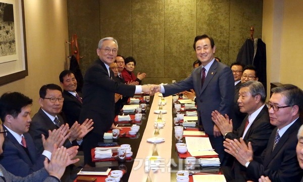 이 사진은 합동 교단 총회장을 비롯한 임원들과 통합교단 총회장을 비롯한 임원들이 한 자리에 모여 손을 잡고