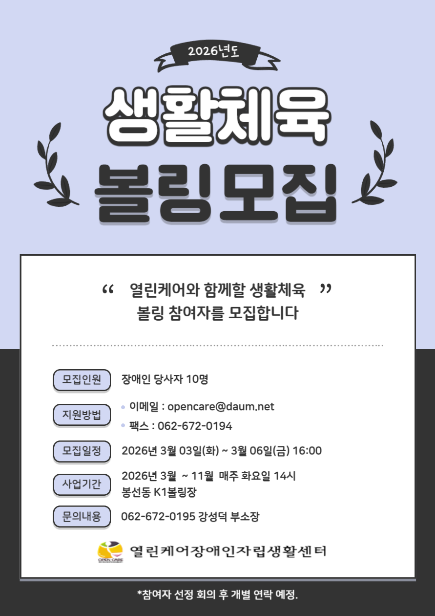 2026년생활체육볼링참여자모집안내 작성자열린케어|작성시간26.03.03|조회수70 목록 댓글 1 글자크기 작게가 글자크기 크게가 2026년참가신청서(생활체육볼링).hwp103.00KB 첨부파일첨부된 파일이 2개 있습니다. png 파일 제목을 입력해주세요_-001.png 다운로드 hwp 파일 2026년참가신청서(생활체육볼링).hwp 다운로드 다음검색 현재 게시글 추가 기능 열기 북마크 신고 센터로 신고 댓글 댓글 1 댓글쓰기 답글쓰기 댓글 리스트 작성자김병국님 | 작성시간 26.03.03 참석합니다 이대형과 함께 댓글 전체보기