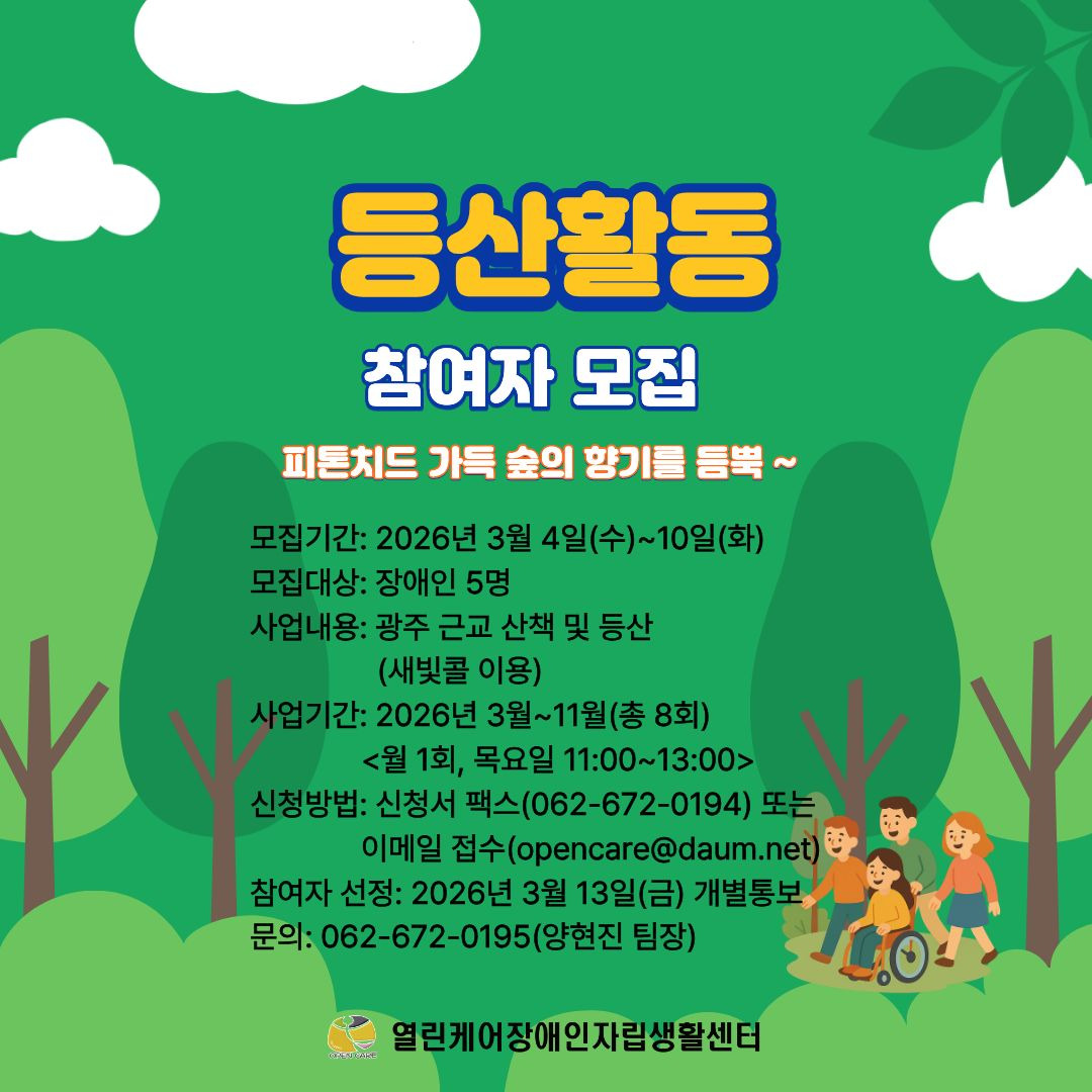 2026년 등산활동 참여자모집 작성자열린케어|작성시간26.03.04|조회수120 목록 댓글 3 글자크기 작게가 글자크기 크게가 2026년 등산활동 참가신청서.hwp145.50KB 첨부파일첨부된 파일이 2개 있습니다. jpg 파일 2026 등산.jpg 다운로드 hwp 파일 2026년 등산활동 참가신청서.hwp 다운로드 다음검색 현재 게시글 추가 기능 열기 북마크 신고 센터로 신고 댓글 댓글 3 댓글쓰기 답글쓰기 댓글 리스트 작성자LOVE TWO | 작성시간 26.03.05 이은선 신청합니다 작성자LOVE TWO | 작성시간 26.03.05 차미애 신청합니다 작성자LOVE TWO | 작성시간 26.03.06 박계영 신청 합니다 댓글 전체보기
