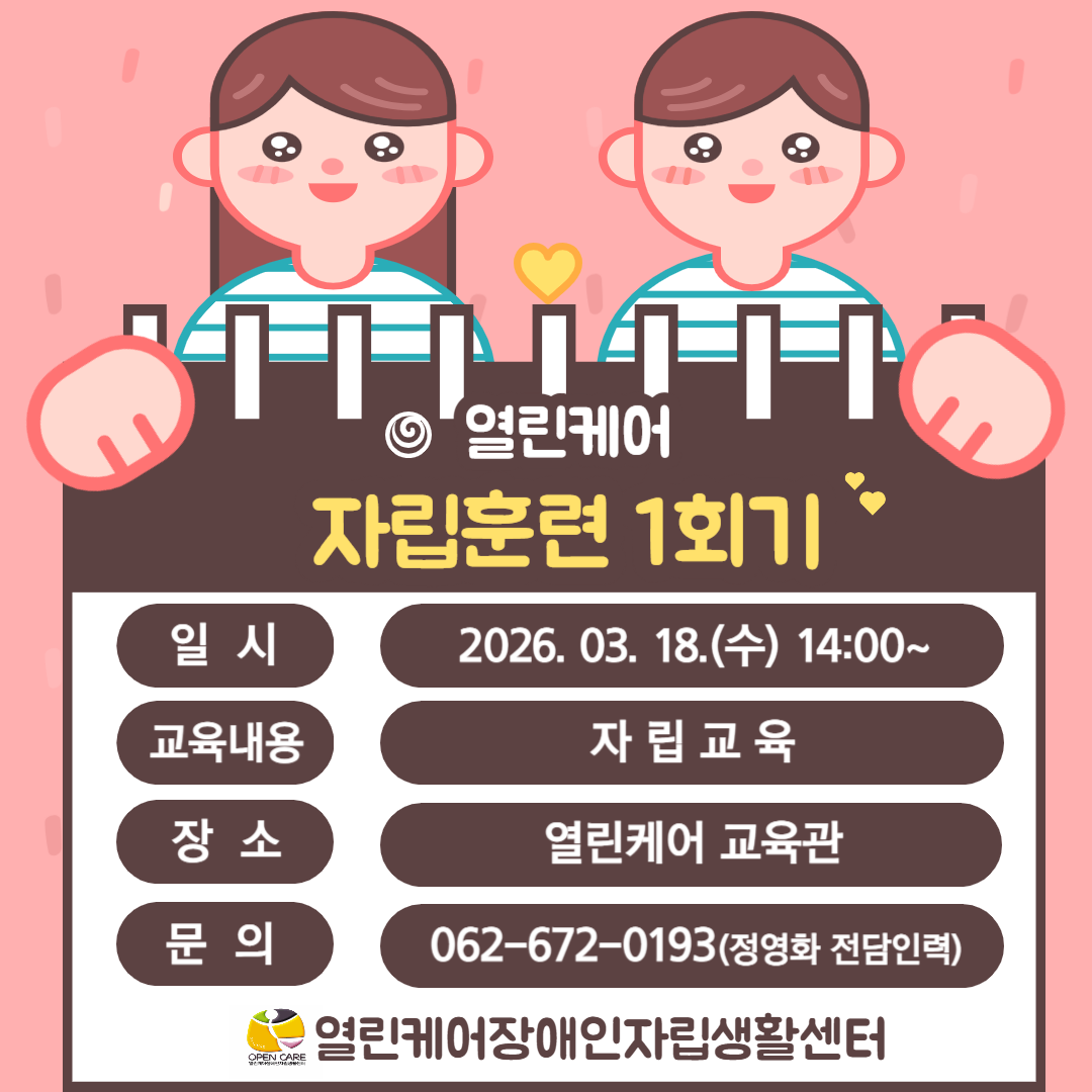 자립훈련 1회기(자립교육) 공지 작성자열린케어|작성시간26.03.12|조회수29 목록 댓글 0 글자크기 작게가 글자크기 크게가 다음검색 현재 게시글 추가 기능 열기 북마크 신고 센터로 신고 댓글 댓글 0 댓글쓰기 답글쓰기 댓글 리스트