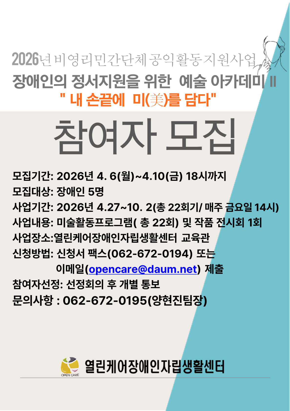 2026년 미술활동 참여자 모집 공지 작성자이경미|작성시간26.04.06|조회수59 목록 댓글 0 글자크기 작게가 글자크기 크게가 미술활동 참가신청서.hwp150.50KB 첨부파일첨부된 파일이 2개 있습니다. png 파일 비영리민간단체 공익활동지원참여자 모집.png 다운로드 hwp 파일 미술활동 참가신청서.hwp 다운로드 다음검색 현재 게시글 추가 기능 열기 북마크 신고 센터로 신고 댓글 댓글 0 댓글쓰기 답글쓰기 댓글 리스트