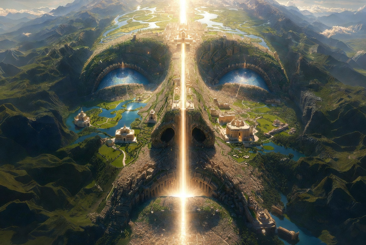 Ultra-large-scale biblical theme park master plan, aerial view from heaven-level altitude, 8K resolution, ultra-detailed, hyper-realistic, cinematic lighting