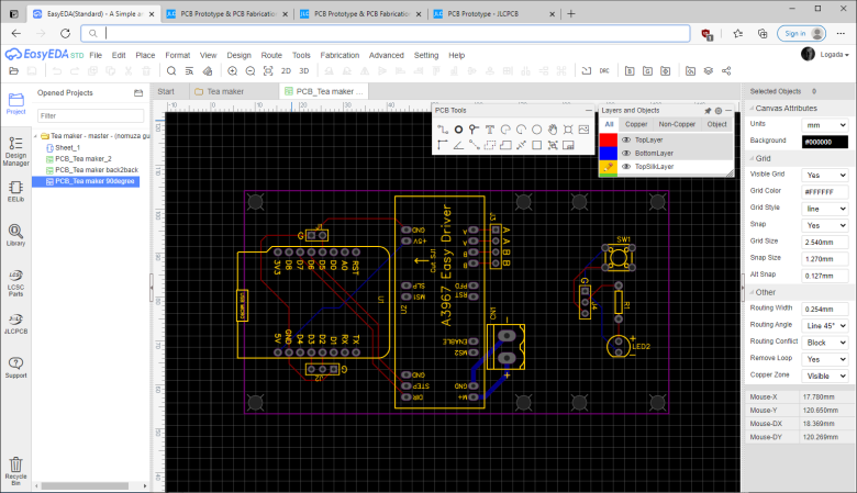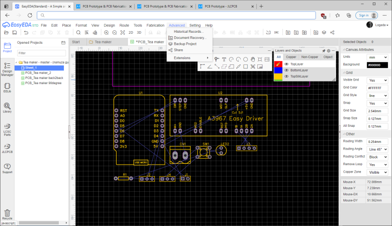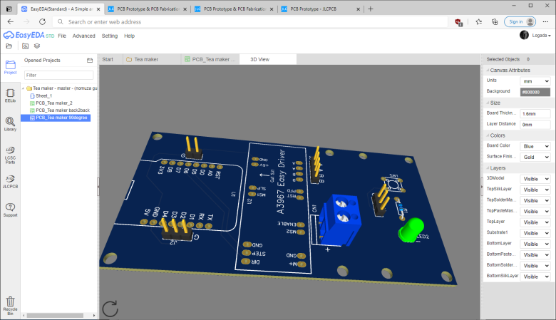 1. 기판은 보시다시피 ESP8266와 step motor driver 보드(Easy Driver)를 연결해주고 LED와 버튼을 따로 빼준 간단한 구성이지만 어쨌든 설계는 해야하므로 EasyEDA라는 프로그램을 사용했습니다. 다운받아서 설치해서 써도 되고 그냥 웹상에서도 잘 돌아가는군요.