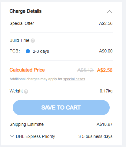 6. JLCPCB에 Gerber파일을 업로드하면 몇가지 옵션을 정하고 바로 주문이 가능합니다. 최소 수량이 5개로 제작비 AU$2.56에 배송비가 무려 $19불입니다. 그외 이것저것 붙다보니 총 22불정도 들었습니다. 다른 나라는 모르겠는데 호주는 저렴한 배송 옵션은 없는 것 같드라구요.