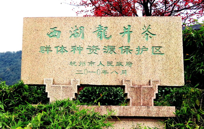 [차밭 사이에 있는 서호용정차 군체종자원보호구임을 알리는 표지석]