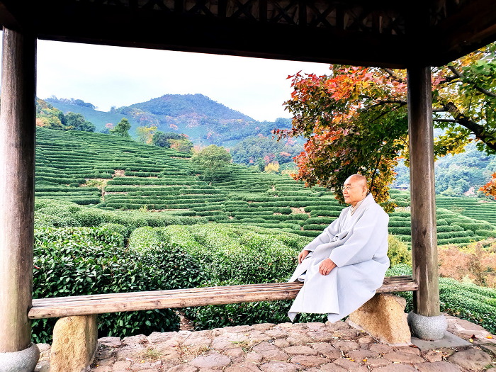 [중간의 정자에서 잠시 쉬며 차밭을 살피던 모습]