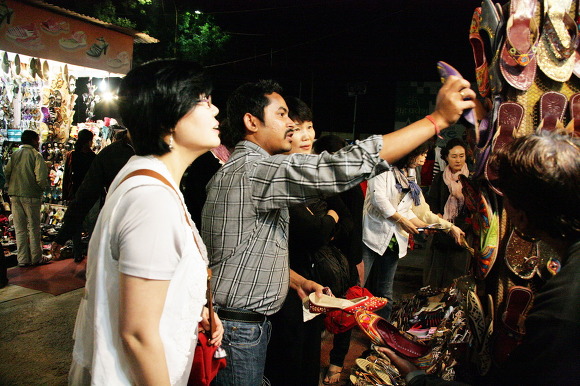 오리엔탈 헤리티지를 나서니 이미 거리에는 어둠과 불빛이 동거를 시작했다. 버스로 잠시 이동한 뒤 복잡한 거리에서 내린 우리는 좀 떨어진 곳에 있는 재래시장으로 향했다. 워낙 복잡한 거리인데다가 신호등도 없는지라 길을 건넌다는 것이 모험에 가깝다. 이런 분위기에 익숙한 핀두가 용감하게 차들을 막더니 우리를 건너게 해 주었다.