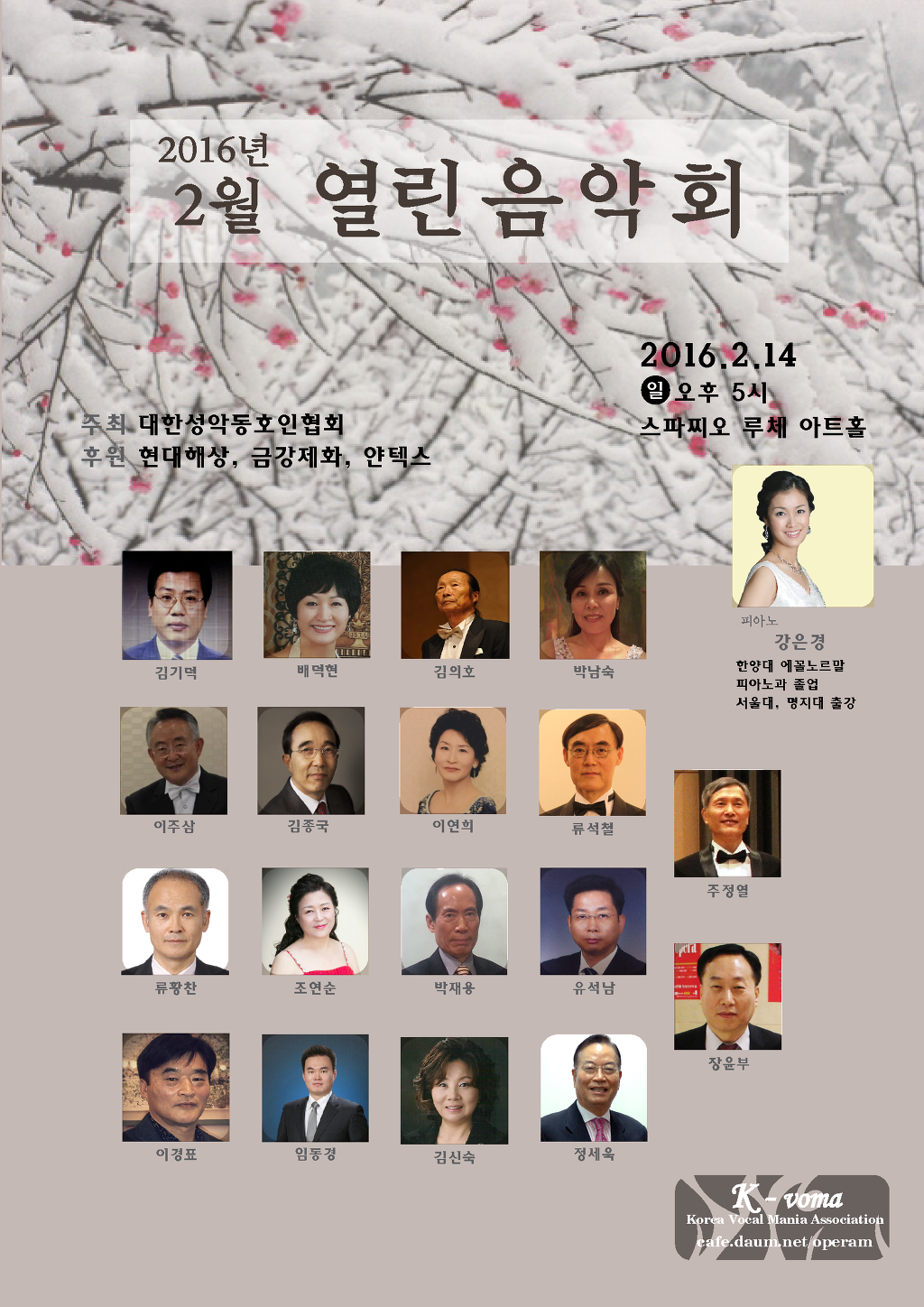 대한성악동호인협회 2월 열린음악회 (2016년 2월 14일 일요일 오후 5시 루체 아트홀) 초대 작성자sylvia|작성시간16.02.03|조회수283 목록 댓글 1 글자크기 작게가 글자크기 크게가 다음검색 현재 게시글 추가 기능 열기 북마크 공유하기 신고 센터로 신고 댓글 댓글 1 댓글쓰기 답글쓰기 댓글 리스트 작성자배유경 | 작성시간 16.02.05 하얀 눈속에서 기필코 꽃망울 터뜨리고 있는 모습이 희망찬 봄을 갈망하는듯 강인함이 보입니다입춘을 맞은 요즘에 딱 맞는 풍경 이네요바탕색이 세련미를 느끼게 하구요조대표님 요즘 건강도 않좋으신데 수고 많으셨습니다감사합니다 댓글 전체보기