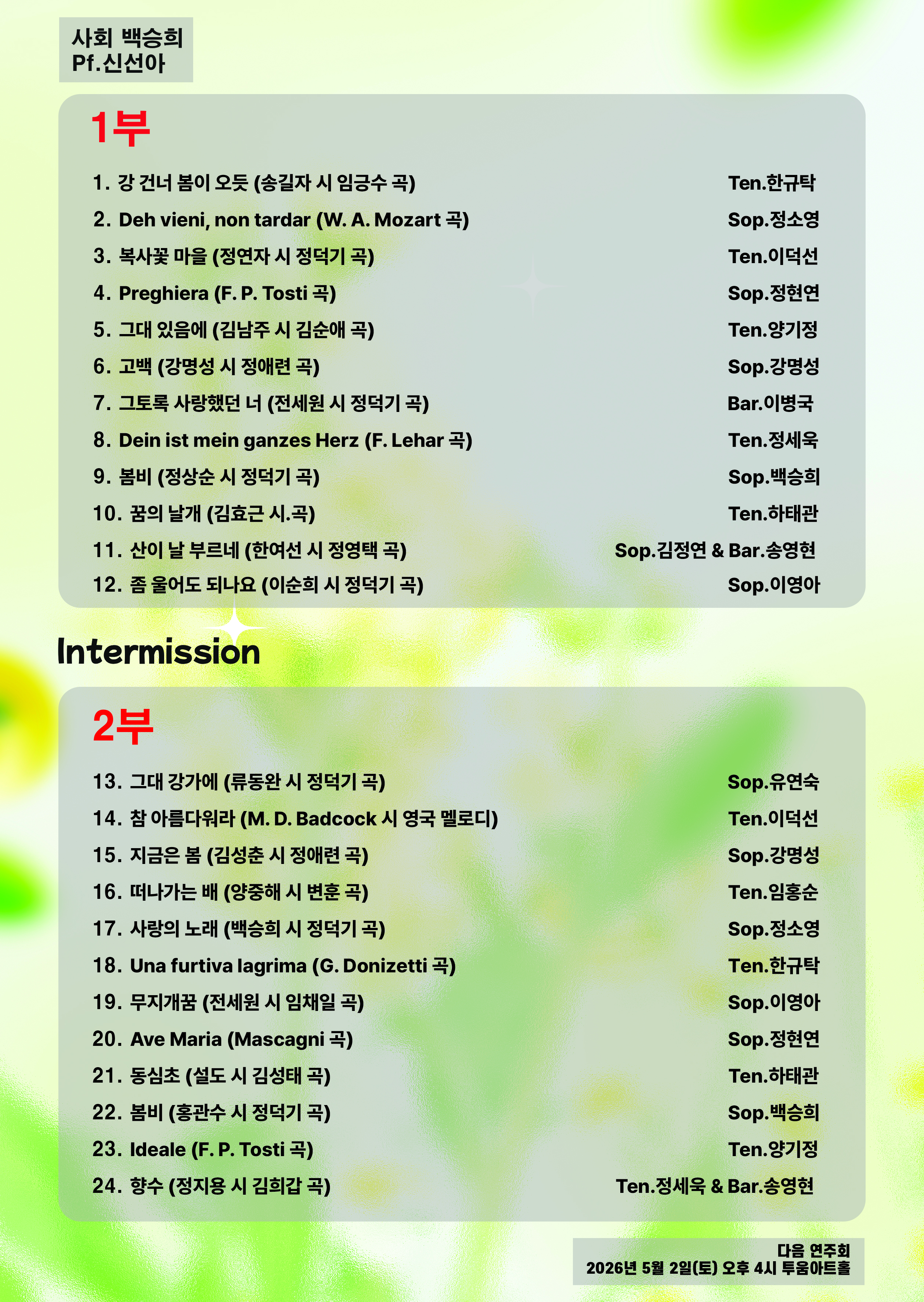 [스크랩] 예술가곡과함께 제29회 연주회 '26년 4월 4일(토) 오후 4시 투움아트홀 작성자노래천사|작성시간26.03.17|조회수23 목록 댓글 0 글자크기 작게가 글자크기 크게가 다음검색 스크랩 원문 : 예술가곡과함께(예가함) 현재 게시글 추가 기능 열기 북마크 공유하기 신고 센터로 신고 댓글 댓글 0 댓글쓰기 답글쓰기 댓글 리스트