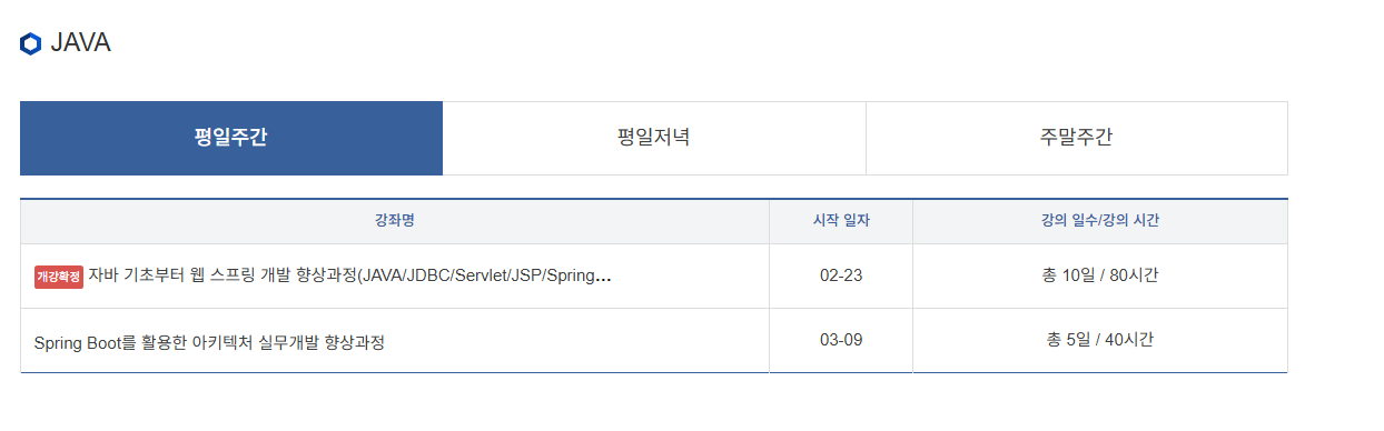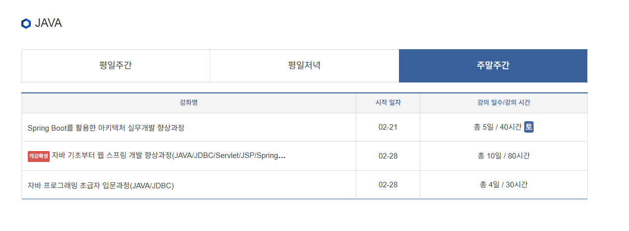 2월 및 3월 오라클자바교육학원은 기업에서 실제 수행하는 기술 스택을 위한 교육으로 자바 웹 스프링 개발훈련을 평일반, 주말반 개강개최 합니다.