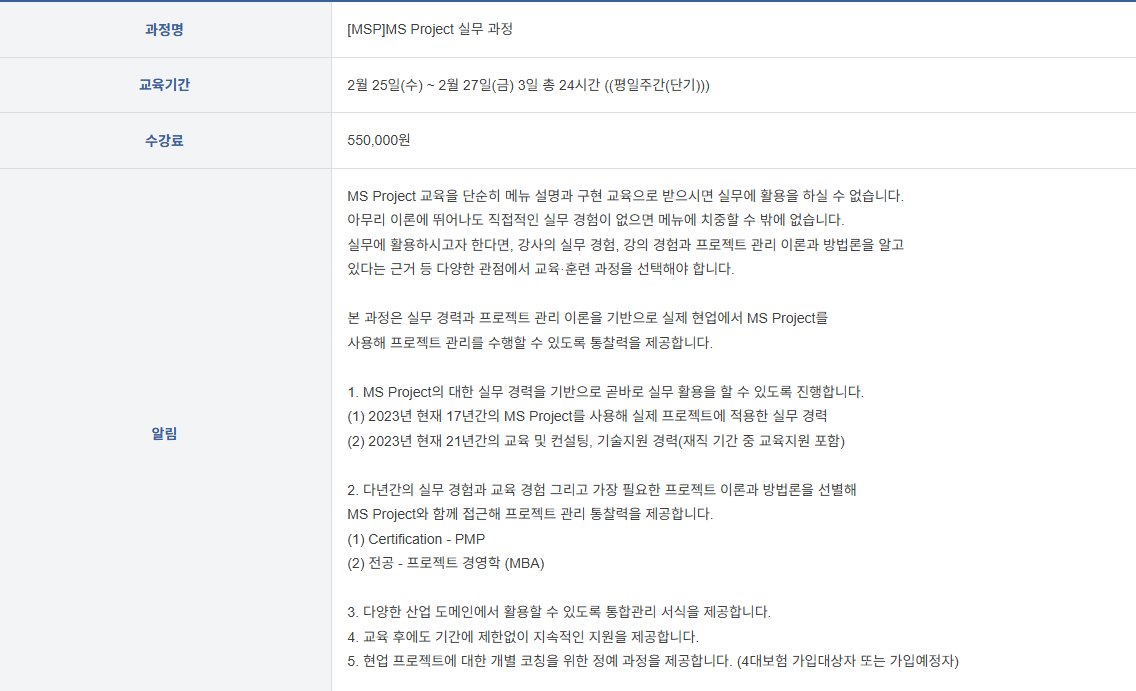 2월25일 평일반 MS프로젝트 MSP 과정은 재직자대상 기업에서 MS프로젝트를 활용하여 프로젝트 수행 및 관리를 위한 대상으로 총3일 24시간 훈련을 통해 완벽하게 배우고 습득하여 프로젝트 업무에 활용까지 할 수 있습니다.
