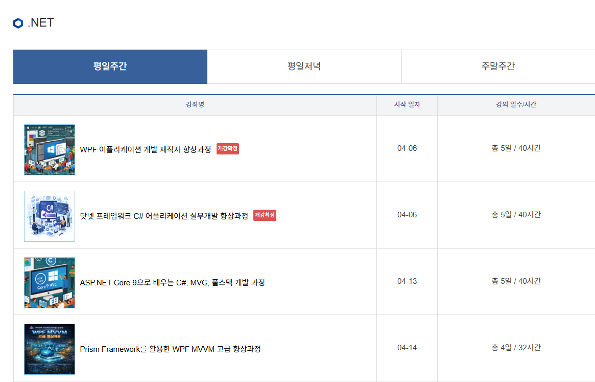 4월 추천드리는 훈련은 4월6일 평일반 일정으로 총5일 훈련기간 40시간 플랜으로 교육을 개최합니다.