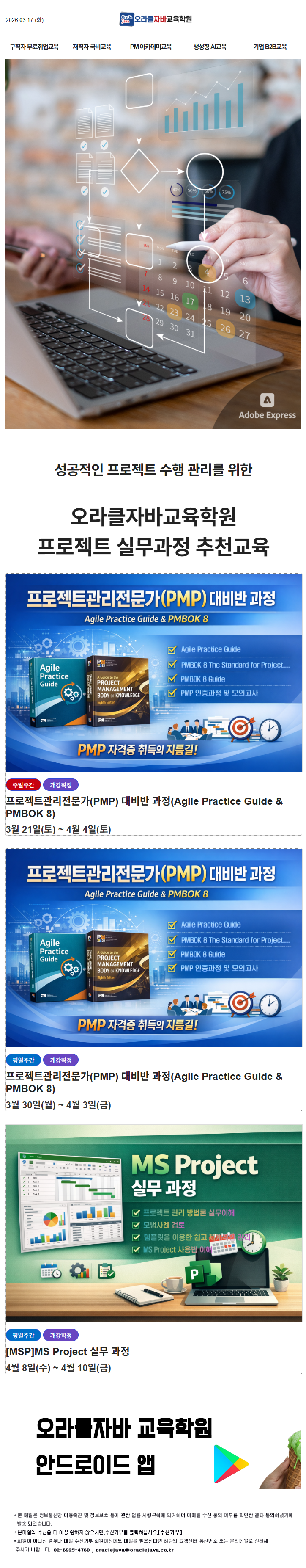 3월 주말반 국비지원 교육과 함께 프로젝트 전문교육 PMP자격증 취득보장 작성자정민이|작성시간26.03.17|조회수1 목록 댓글 0 글자크기 작게가 글자크기 크게가 다음검색 현재 게시글 추가 기능 열기 북마크 공유하기 신고 센터로 신고 댓글 댓글 0 댓글쓰기 답글쓰기 댓글 리스트