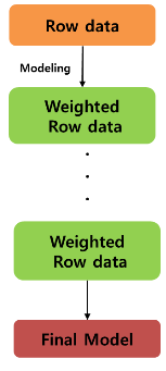 부스팅 : 전체 데이터에서 여러 샘플링 데이터를 추출하여 순차적으로 이전 학습 분류기의 결과를 토대로 다음 학습 데이터의 샘플 가중치를 조정하면서 학습을 진행