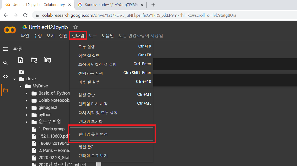 4-1. 상단에 런타임 클릭 후 런타임 유형 변경 클릭