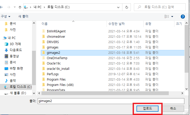 자신이 저장한 gimages 폴더를 클릭하고 업로드