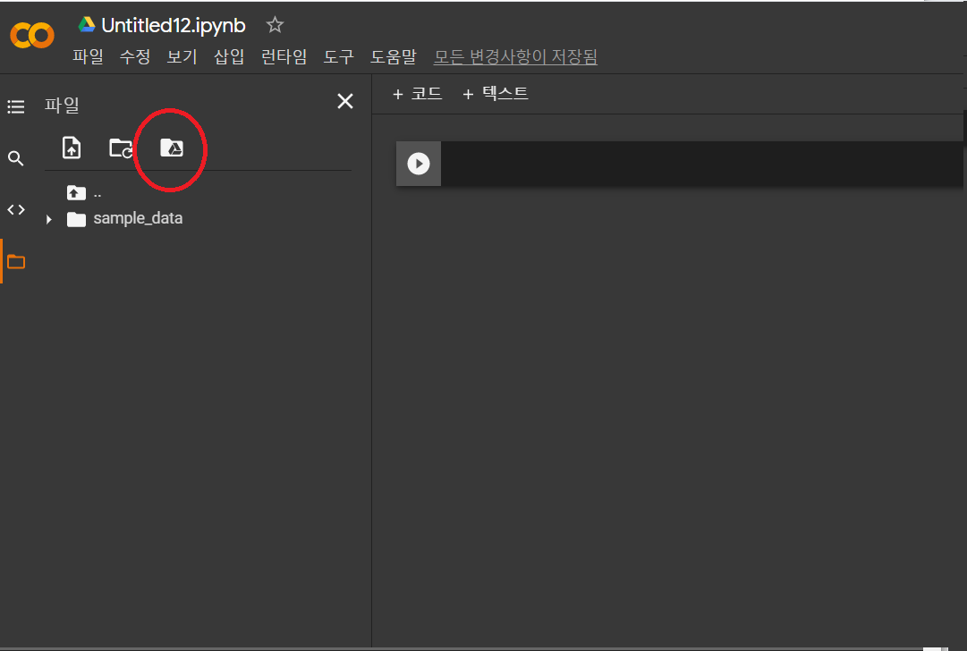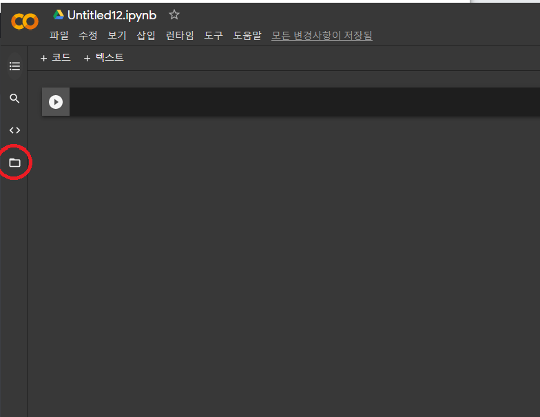 2-3. 코랩과 구글 드라이브 연동을 위해 좌측 에 있는 폴더 아이콘 선택( 빨간 동그라미 안 )