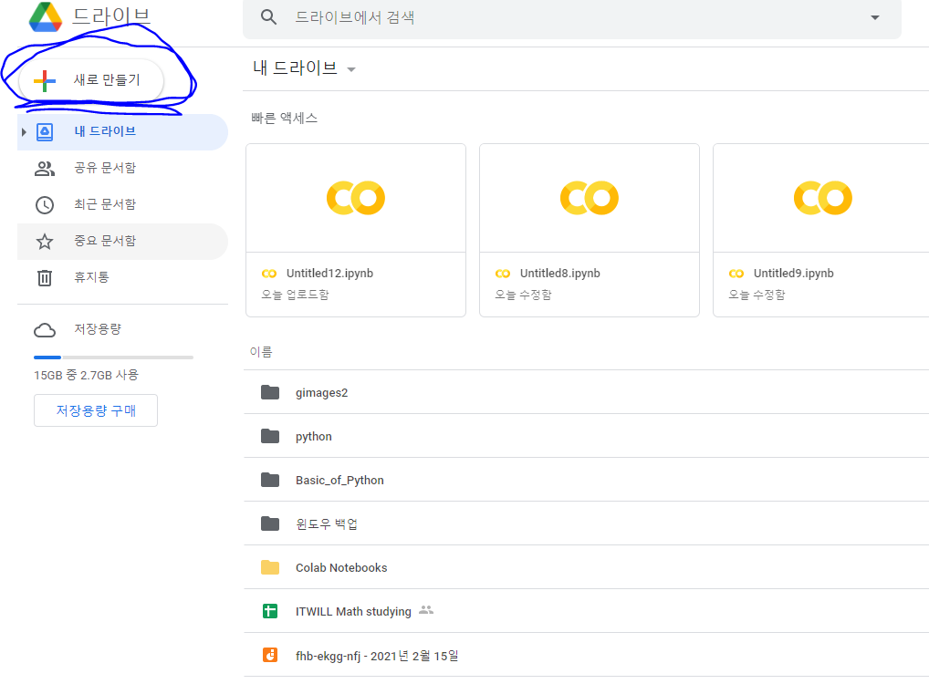 1-1. 구글 드라이브에 접속하기 ( 사진 폴더를 업로드 하고 코랩에 불러오기 위함 )