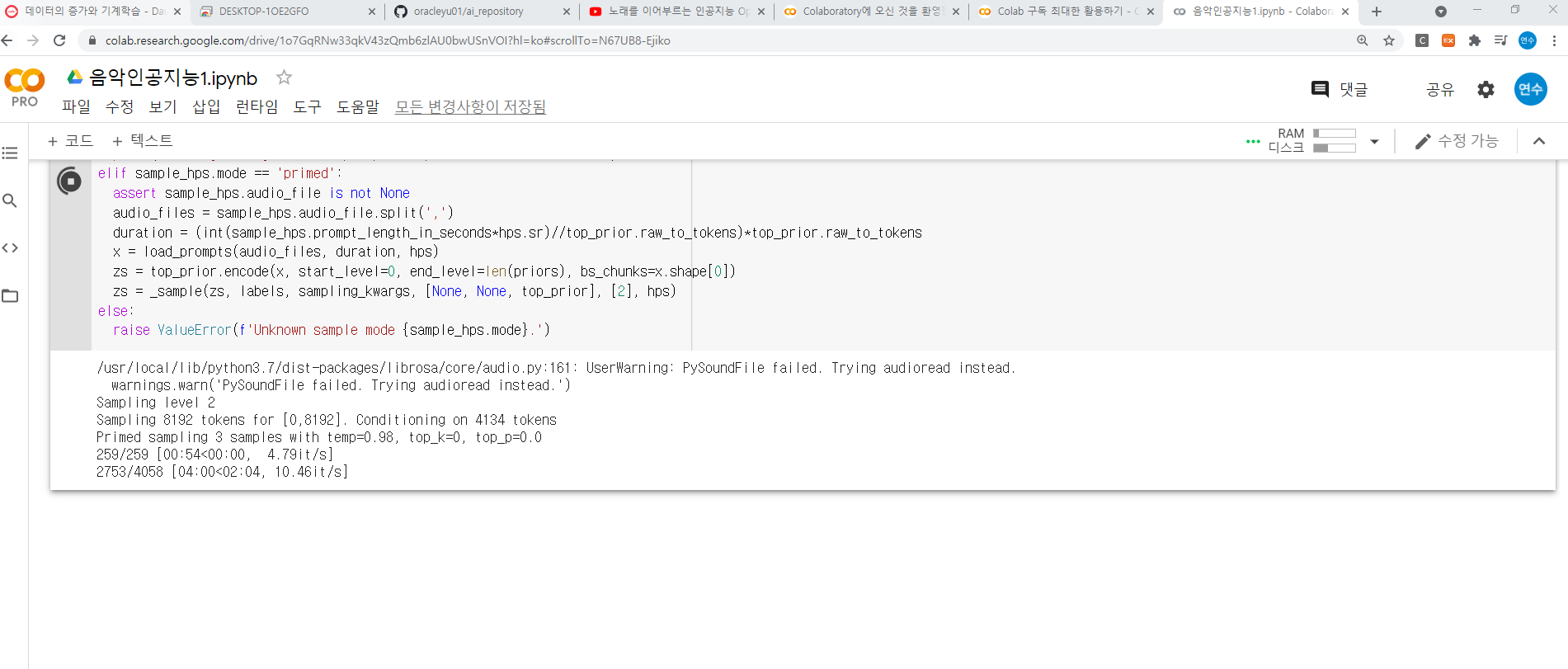 4. 인공지능이 노래 학습 진행중인 결과화면입니다.