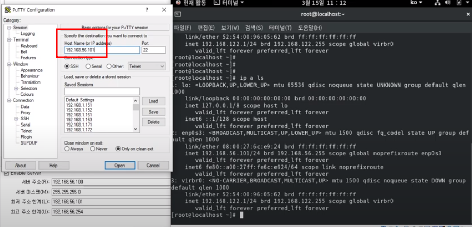 #44. PUTTY 로 접속합니다. 192.168.56.101 로 접속합니다.