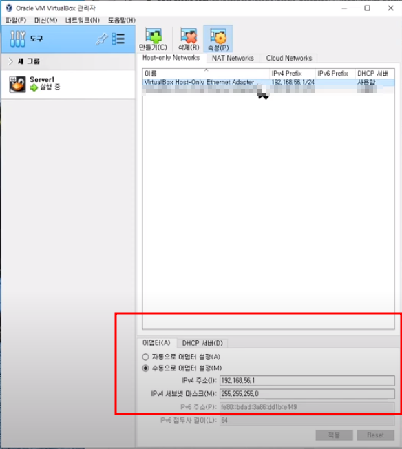 그래서 호스트 전용 어뎁터로 하겠습니다. 그러면 서버내에서 아이피를 하나 할당 받아서 사용하는것입니다.
