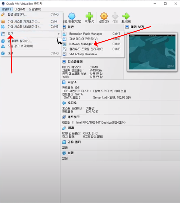 #38. vm 의 메뉴에 도구의 network manager 를 누룹니다.