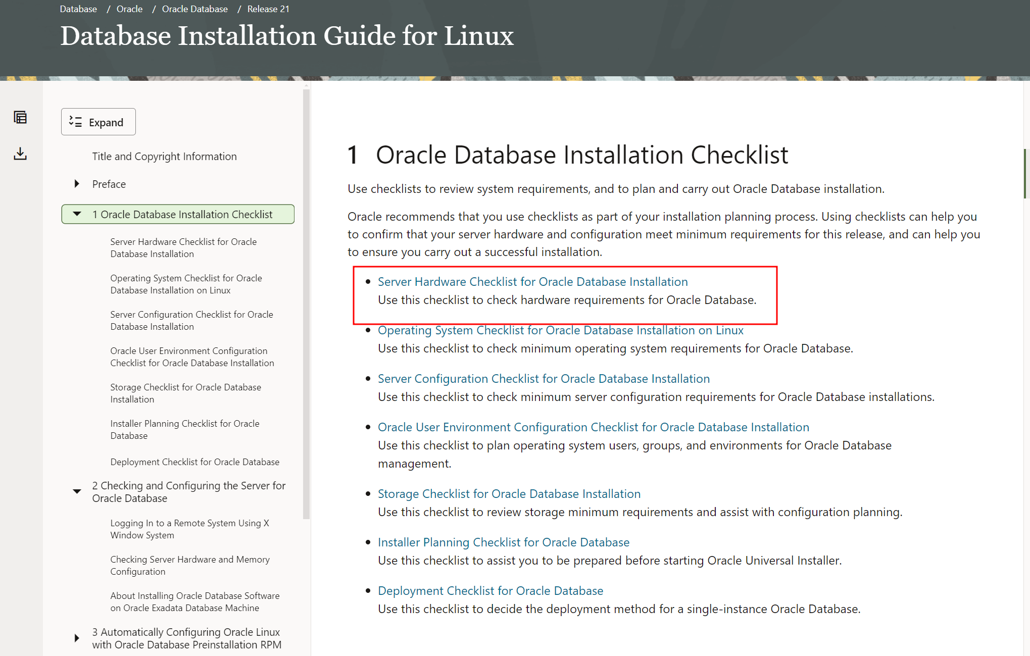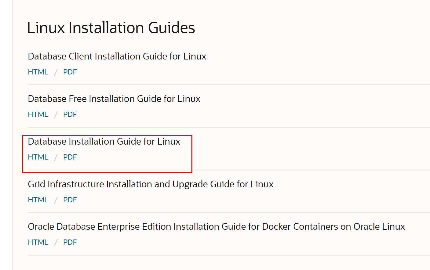 #5. database installation Guide for linux 에서 html 을 누르세요.