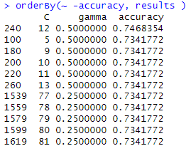 results <- rbind( results, data.frame(C=C, gamma=gamma, accuracy=accuracy))