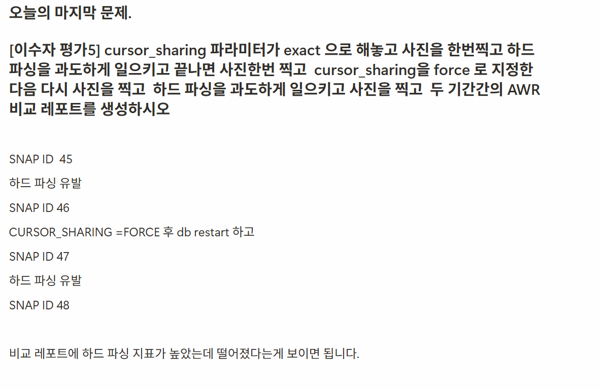 오늘의 마지막 문제. [이수자 평가5] cursor_sharing 파라미터가 exact 으로 해놓고 사진을 한번찍고 작성자유연수|작성시간25.09.08|조회수46 목록 댓글 0 글자크기 작게가 글자크기 크게가 다음검색 현재 게시글 추가 기능 열기 북마크 공유하기 신고 센터로 신고 댓글 댓글 0 댓글쓰기 답글쓰기 댓글 리스트
