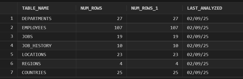 | select o.table_name, o.num_rows, n.num_rows, o.last_analyzed from user_tables@LINK_ORCL_HR o , user_tables n where o.table_name = n.table_name; |