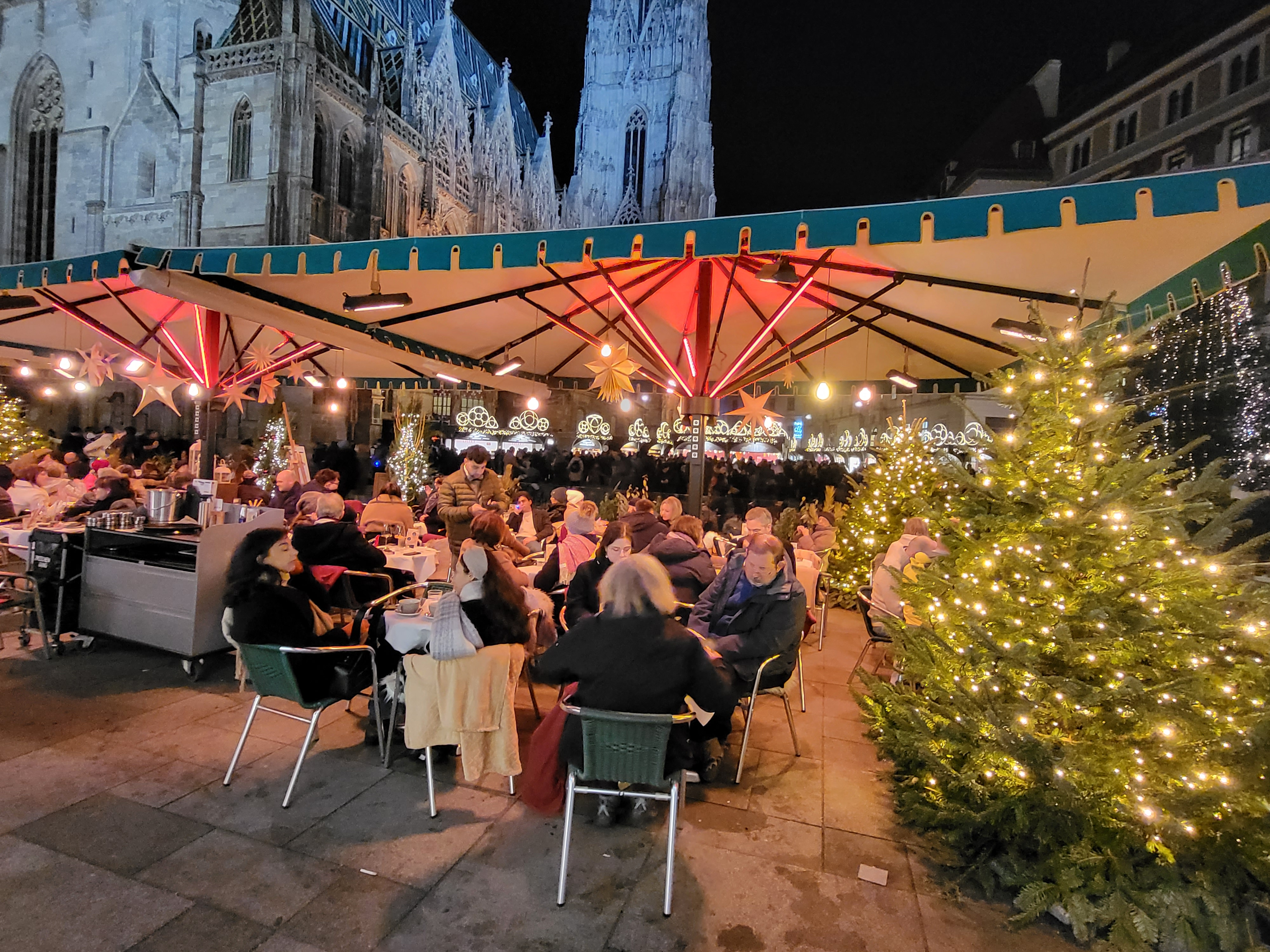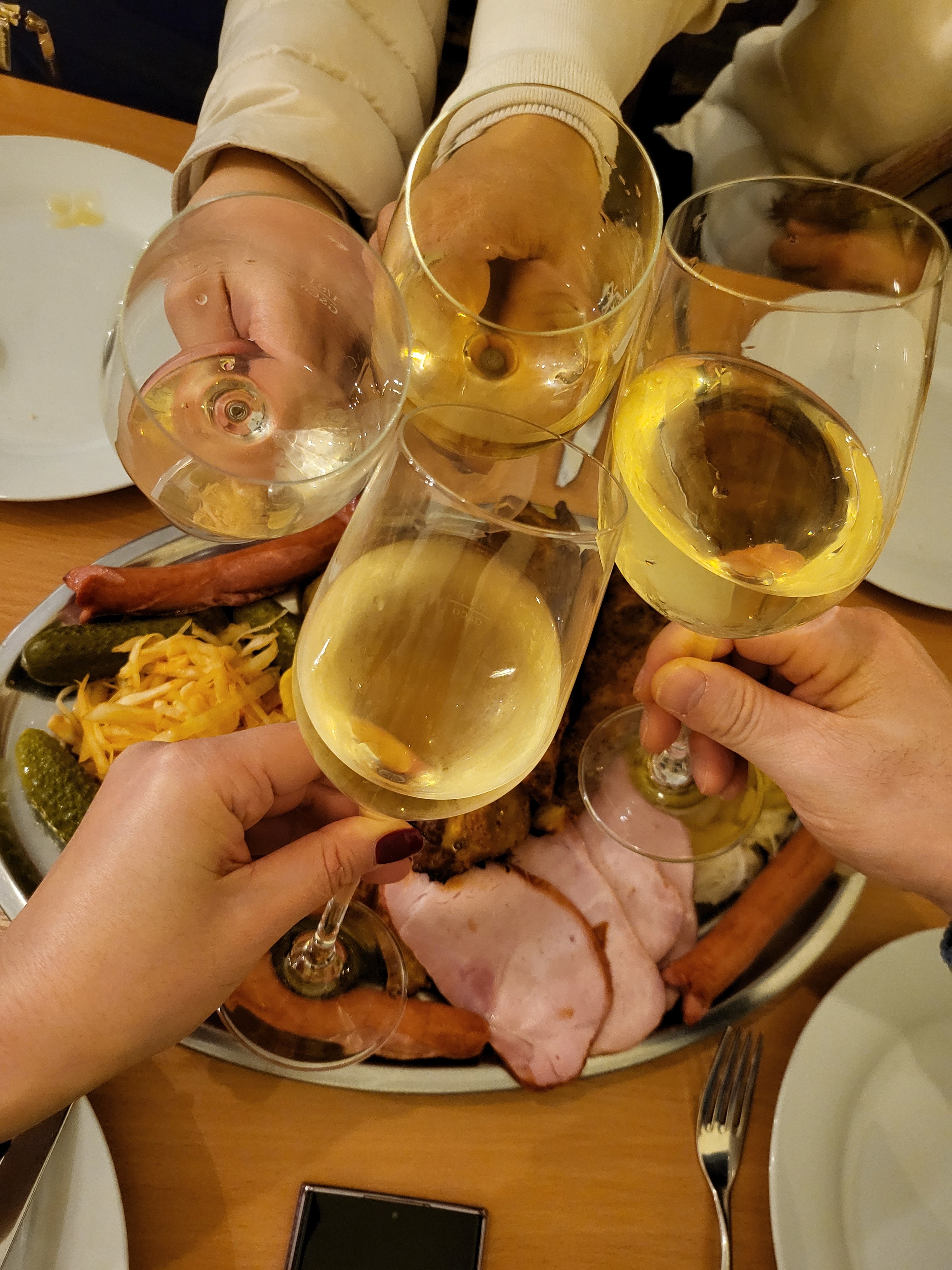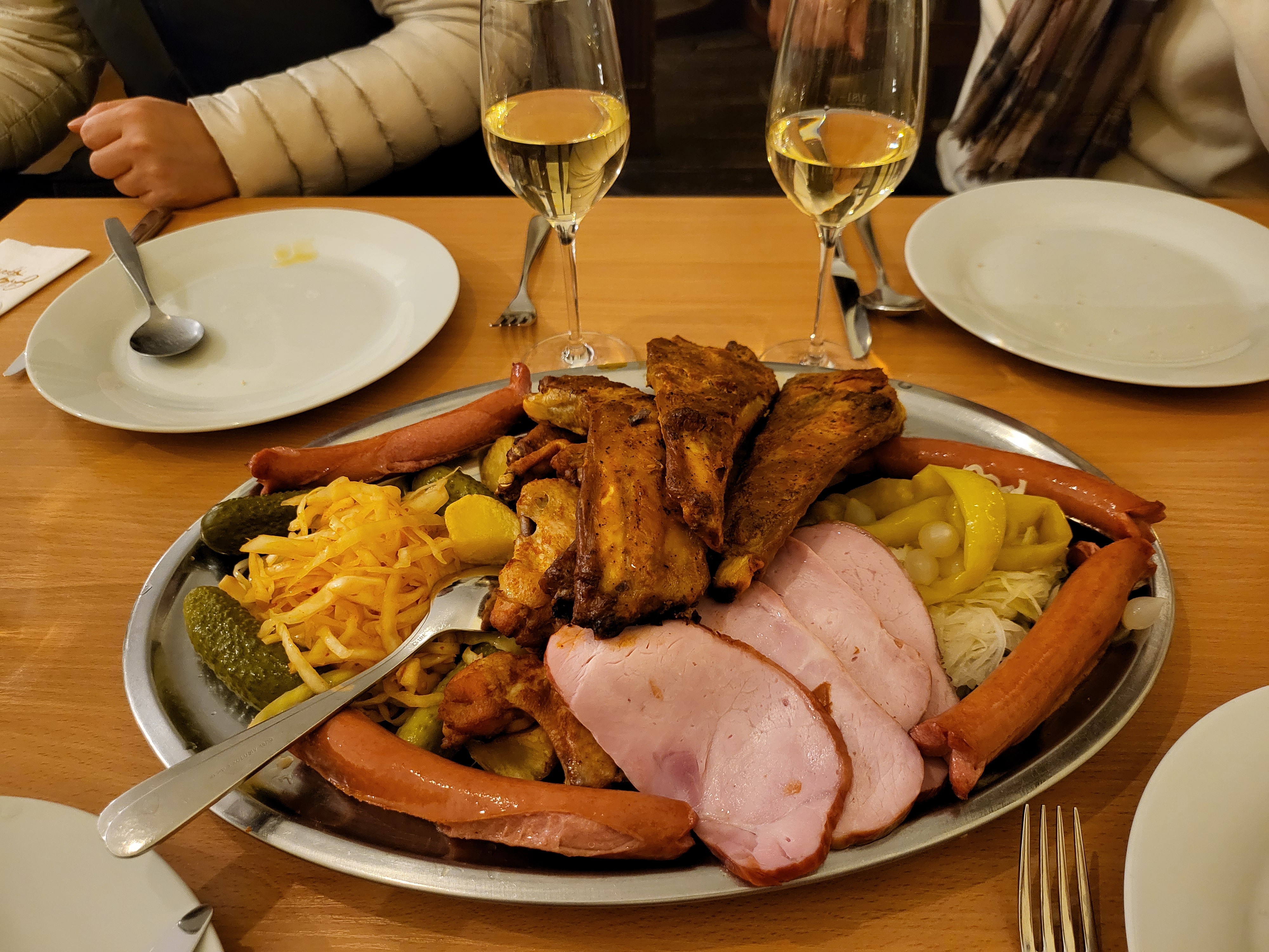 와~ 시내 한복판에 저렇게 거대하고 근사한 사원이 있다니요. 밤에 보는 슈테판 사원(Domkirche St. Stephan)은 웅장함을 넘어서서 고귀함이 느껴져 넋을 잃고 봤어요. 오스트리아 최대의 고딕양식 건축물이자 오스트리아의 중요한 역사마다 산 증인의 역할을 한 슈테판 대성당은 모짜르트의 결혼식과 장례식도 모두 이 곳에서 치러졌다고 하네요. 우리는 슈테판 성당과 게른트너 거리(Karntner strasse)를 짧게 느껴보고 내일 밝을 때 다시 오기로 하고, 비엔나 전통 음식 호이리게(Heurige) 맛집으로 향했습니다. 호이리게는 소시지, 햄, 치킨, 감자, 채소 절임 등이 플래터처럼 나오는 음식인데 와인 안주로 딱이었어요~