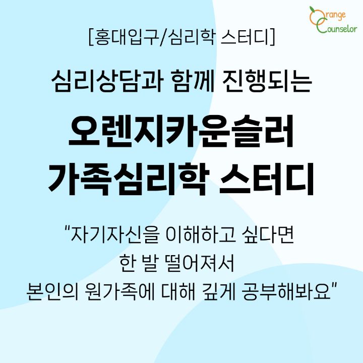 저희 오렌지카운슬러는 많은 분들께서 관심을 가져주셨던 가족심리학 스터디를 7월 2일(일) 10시로 추가개설하게 되었습니다.