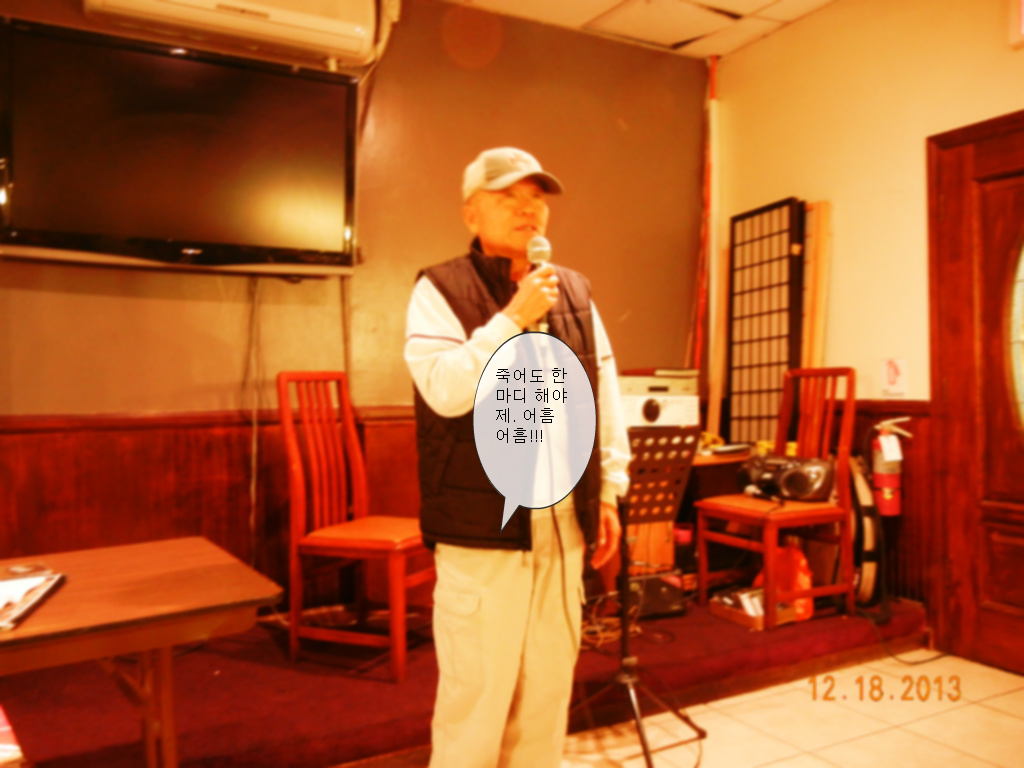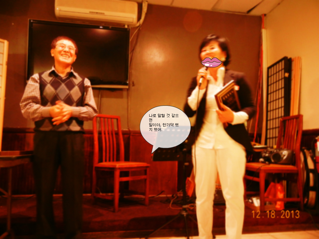 저희들을 위해서 온 몸으로 봉사하시는 정찬열 회장님께 다시 한번 진심어린 감사를 드림니다. 또 언제나 저희를 잊지 않으시는 변 재무 2 대 회장님, 도네이숀도 해주셔서 감사 함니다. 소설가 이 용우 선생님, 바쁘신 중에도 참석하셔 저희들 자리를 빛내 주셔씀니다. 하프 연주로 우리를 즐겁게 해주신 공동진 부회장님,