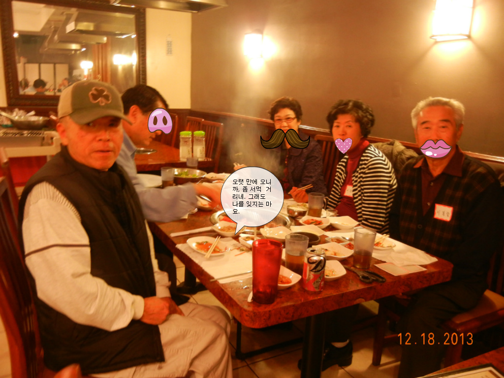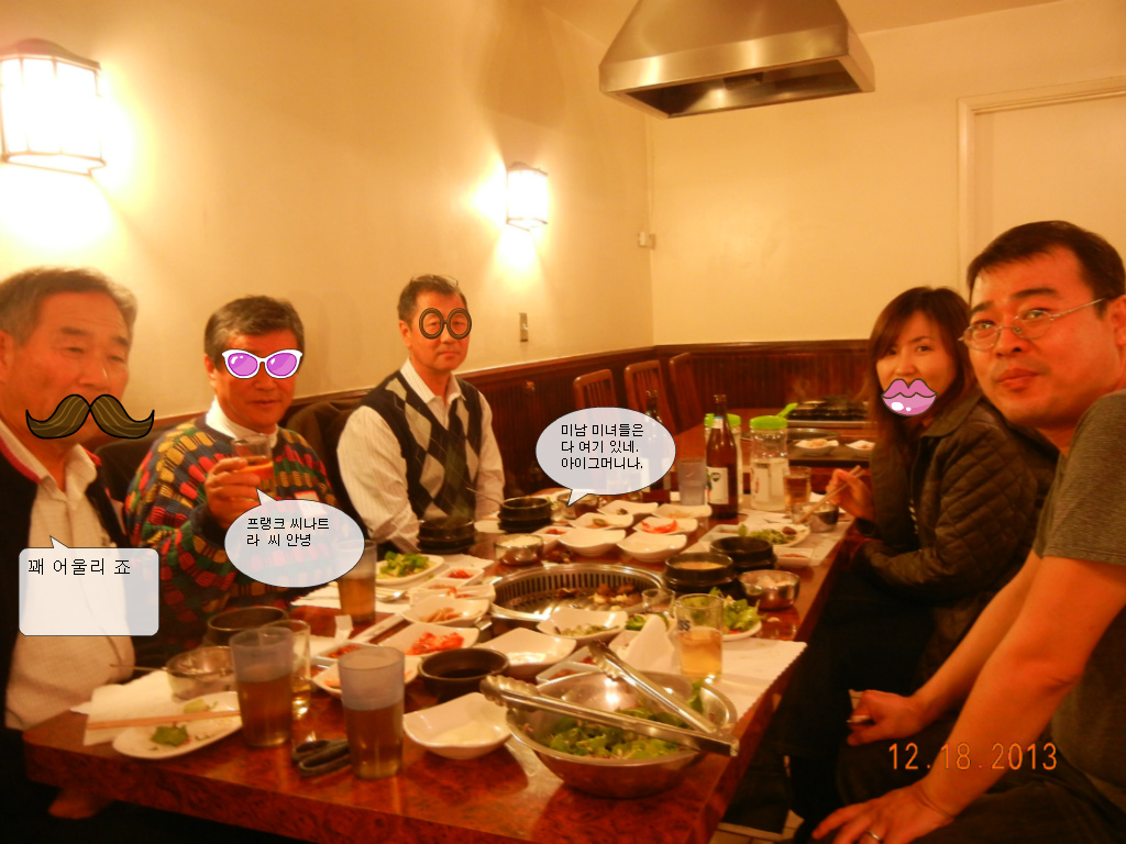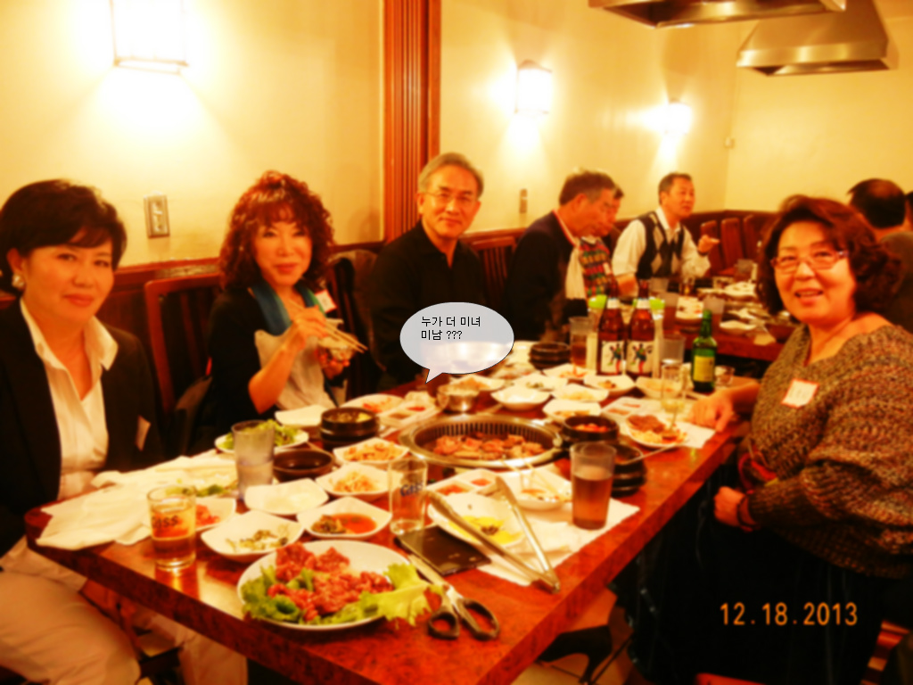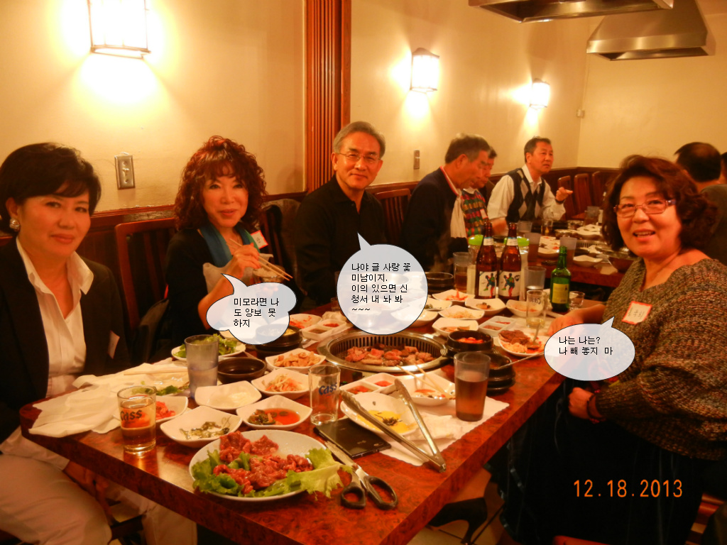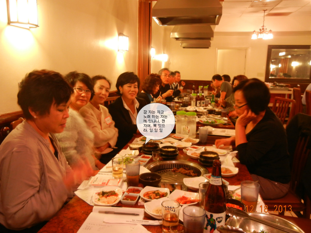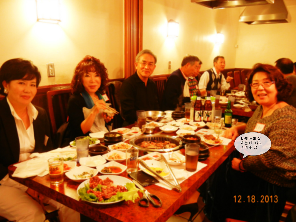 저희 오렌지 글사랑 파티가 2013 년, 12 월 18 일 수요일 오렌지 카운티 인천원에서 있었슴니다.금년에 수필가로 등단하신 최정미, 유경자 선생님에게 등단 감사패를 정 찬열 회장님이 증정해 주셨슴니다. 갈아앉은 경제와 바쁜 일정에도 불구하고 많은 분들이 참석해 이 자리를 빛내 주었슴니다.
